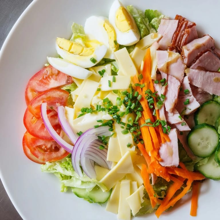 A traditional chef salad features a combination of cold cuts like ham and turkey, Swiss and cheddar cheese, hard-boiled eggs, and fresh vegetables arranged on a bed of crisp lettuce. The key is quality deli meats and good cheese, plus a well-balanced vinaigrette dressing.